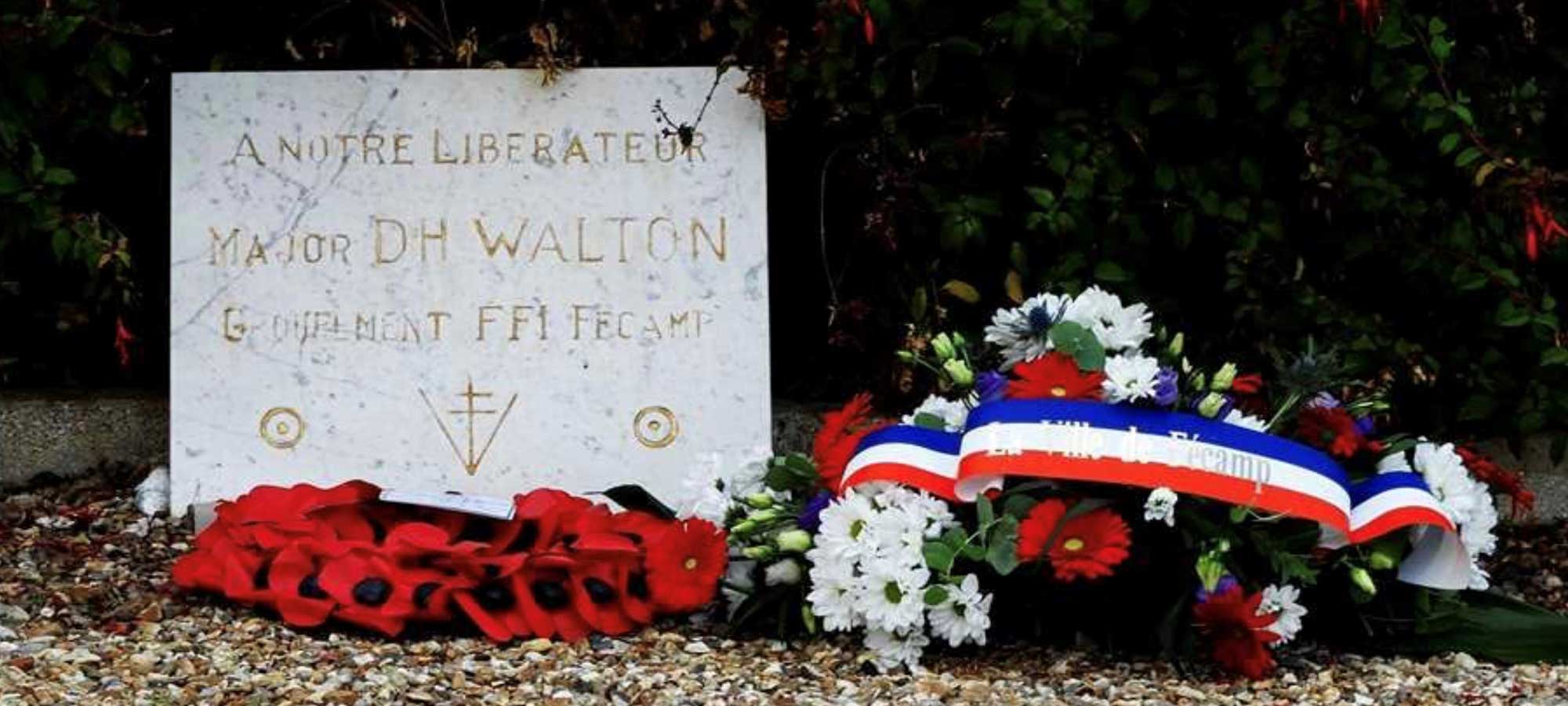 Below: The 'Forces Françaises de l'Intérieur' memorial plaque to Major Dennis Walton MC RM who was killed on 4th September 1944 when the jeep he was in ran over a mine.